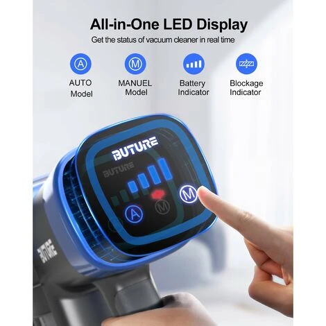 - 【Display LED 】Buture VC50 Scopa Elettrica Senza Fili , tutte le funzioni possono facilmente regolare la potenza di aspirazione dell’aspirapolvere scorrendo sullo schermo LCD, che è comodo e veloce.