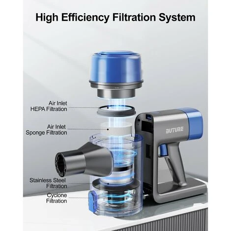 - 【Filtrazione ad alta efficienza】Buture VC50 aspirapolvere , con filtrazione HEPA a 5 stadi completamente sigillata, può catturare polvere e particelle fino a 0,3 micron ed espellere aria fresca e pulita. La lettiera di grandi dimensioni da 1,2 litri contiene tutta la polvere e i peli di animali domestici.