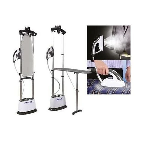 Asse da stiro pieghevole e richiudibile. Potenza 2200-2400 Watt, capacità serbatoio 1000 ml., pre-riscaldamento 3 min., periodo di lavoro 30 min., pressione max 4 bar., temperatura regolabile max 130 °C, vapore 2in1 regolare + getto.